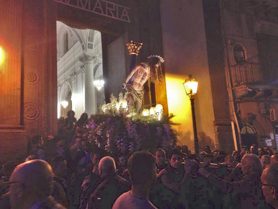 La Settimana si è aperta domenica 9 aprila con la Via Crucis vivente, a cura dei ragazzi dell’Oratorio del Rosario. Giovedì Santo, 13 aprile, si è svolta la struggente processione della seicentesca statua di Cristo alla colonna, uscita dalla chiesa di San Sebastiano nel pomeriggio e rientrata in nottata. La statua di Cristo, secondo una leggenda, sarebbe legata a un colonna, ma con una corda senza nodo, per grazia di un angelo. Il simulacro è stato portato a spalla da alcuni fedeli i quali, eseguendo i tipici “3 passi avanti e 2 indietro” hanno conferito un’andatura lenta e tormentata alla statua. Al seguito un corteo formato dal clero e dalle confraternite cittadine.
