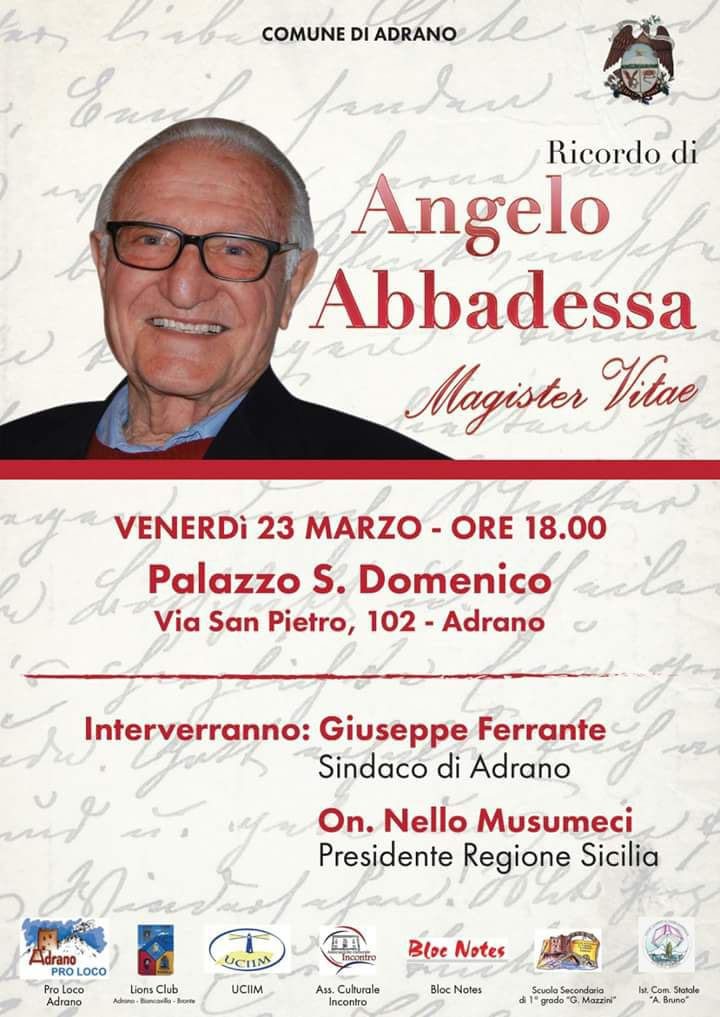 Verrà ricordato venerdì ad Adrano, presso Palazzo San Domenico, nel corso di una iniziativa fissata per le 18, il compianto preside Angelo Abbadessa scomparso a Roma, all’età di 88 anni, nello scorso mese di dicembre. All’incontro pubblico promosso dal Comune di Adrano, interverranno il sindaco della cittadina Pippo Ferrante e il Presidente della Regione Siciliana Nello Musumeci.