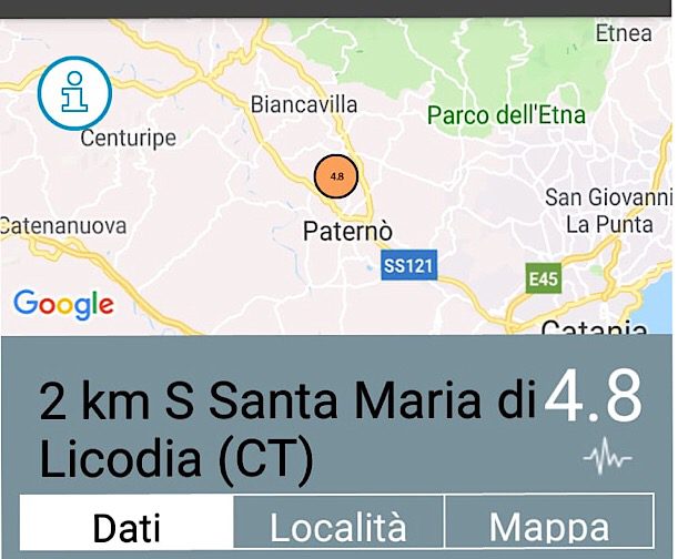 Una violenta scossa di terremoto di magnitudo 4.8 si è verificata alle 2:34 nel comprensorio di Adrano, Biancavilla e Santa Maria di Licodia. L’epicentro a 2 chilometri a sud di quest’ultimo centro abitato al confine con Paternò, con una profondità di 8 chilometri. A Santa Maria di Licodia, al momento, si registra il crollo di un cornicione del palazzo Ardizzone e di alcuni muretti a secco. Crepe anche nel palazzo di città. A Biancavilla ingenti danni alla chiesa dell’Idria. Molte crepe all’interno delle abitazioni. Alle 2:59 un’altra scossa di magnitudo 2.5 con epicentro a 3 chilometri sud ovest di Biancavilla. A Paternò caduti alcuni calcinacci dala chiesa di Santa Barbara e alcune strade si sono lesionate. Crollata anche una vecchia abitazione di campagna, disabitata, nelle vicinanze dell’epicentro. Gran parte della popolazione si è riversata per le strade dei centri etnei e al momento non vuole rientrare in casa. Sul territorio diverse le squadre dei Vigili del Fuoco che stanno valutando le diverse segnalazioni pervenute alla centrale operativa. Alcune persone sarebbero rimaste lievemente ferite e sono atate trasportate al Pronto Soccorso. Diverse le persone che si sono recate al nosocomio biancavillese in stato di choc