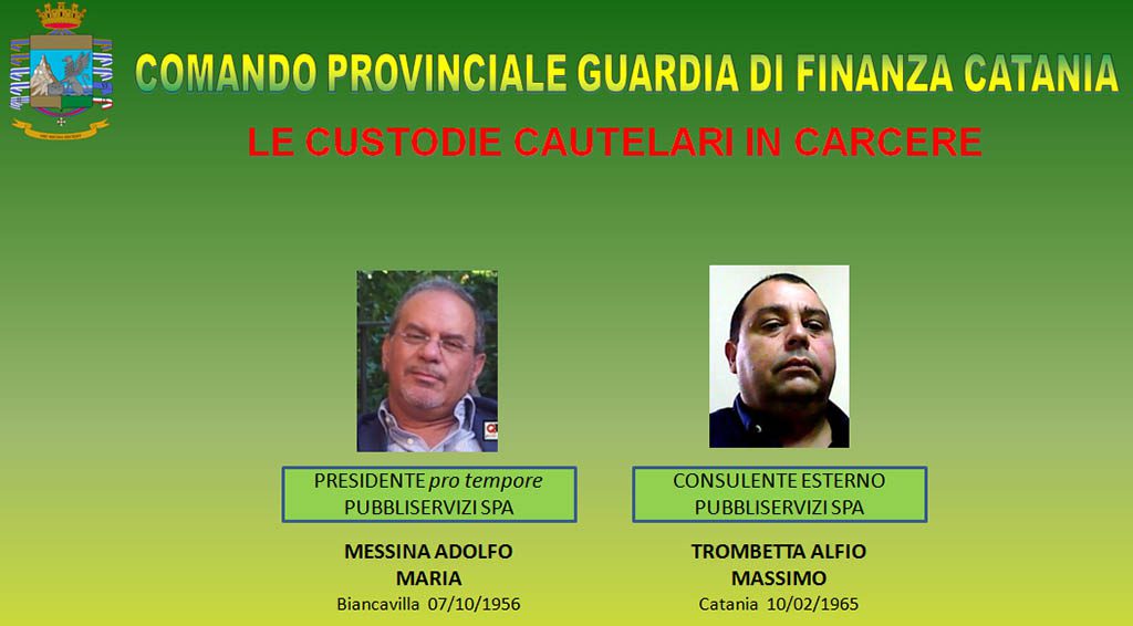Destinatario della misura cautelativa in carcere l’ex Presidente della Publiservizi, Adolfo Messina (61 anni), paternese, attuale direttore editoriale di QTSicilia Magazine. Messina è stato nominato presidente della Pubbliservizi dall’attuale Presidente della Regione Siciliana Rosario Crocetta un anno fa. Le dimissioni sono giunte a dicembre. Insieme a lui è finito in carcere Alfio Massimo Trombetta, 52 anni, consulente della società.