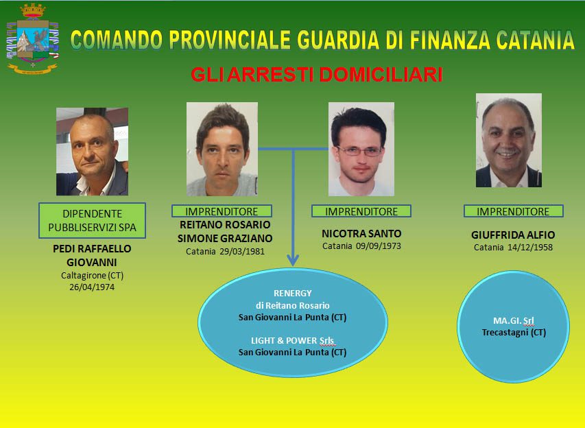 – Rosario Simone Graziano Reitano (36 anni) e Santo Nicotra (44 anni) imprenditori e amministrari di fatto della ditta individuale “Renergy di Reitano Rosario” esercente l’attività di “lavori di installazione di impianti elettrici” e avente sede in San Giovanni La Punta e della società “Light and Power SRLS” esercente l’attività di “commercio all’ingrosso di materiale elettrico” e avente sede a San Giovanni La Punta;