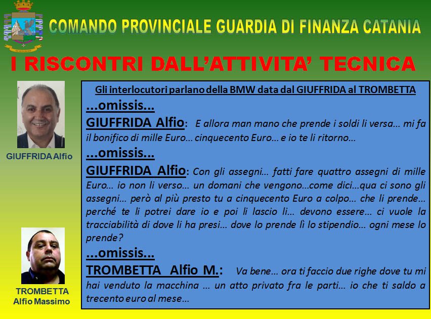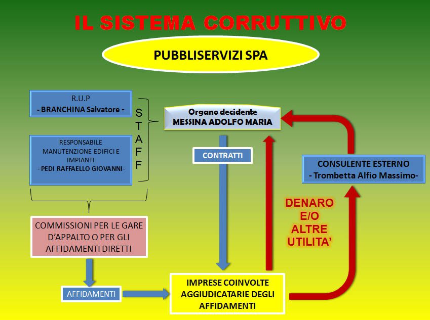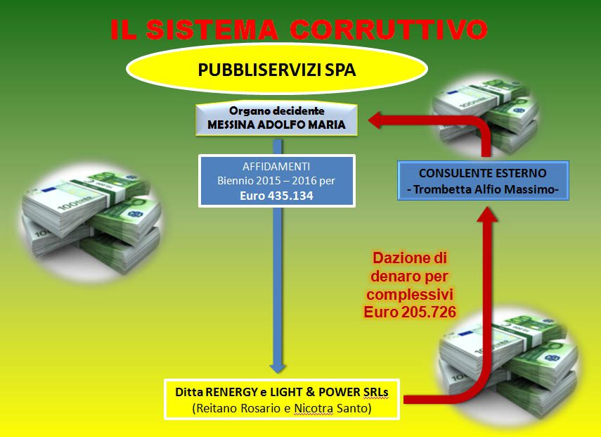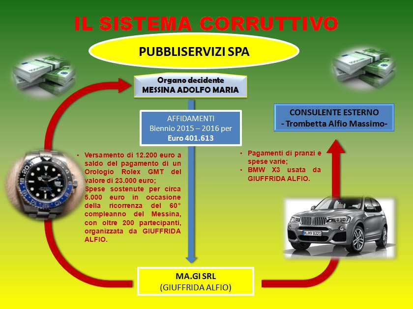 L’investigazione, svoltasi tra i mesi di settembre e dicembre dell’anno scorso, fondatasi su accertamenti bancari, perquisizioni, analisi documentali e intercettazioni telefoniche nonché dichiarazioni di dipendenti della Pubbliservizi ed imprenditori affidatari di lavori, ha messo in un luce un collaudato sistema corruttivo orchestrato dall’ex presidente della Pubbliservizi Messina e dal suo stretto collaboratore Trombetta che, avvalendosi del contributo determinante di Pedi, indirizzavano l’affidatamento di lavori e servizi a imprese terze corrotte traendone svariate utilità. Per Messina e Trombetta, oltre a registrare ingiustificati versamenti sui propri conti correnti o quelli di stretti congiunti per oltre 200.000 euro, i Finanzieri del Nucleo di Polizia Tributaria di Catania accertavano la corresponsione da parte degli imprenditori corrotti di altri benefici quali la consegna gratuita di una BMW X3, il pagamento di pranzi e cene nonché di vestiti firmati, il contributo di oltre 10.000 euro per l’acquisto di un Rolex e il sostenimento dei costi per feste private. Per il dipendente della Pubbliservizi, Raffaello Giovanni Pedi, pienamente consapevole del disegno criminoso in essere, il beneficio essenziale è consistito nel mantenere intatto il proprio inquadramento contrattuale in un contesto lavorativo caratterizzato da ingiustificati demansionamenti o spostamenti d’incarico operati dal presidente Adolfo Messina, dal suo insediamento, per attorniarsi di una ristretta cerchia di persone fidate.
