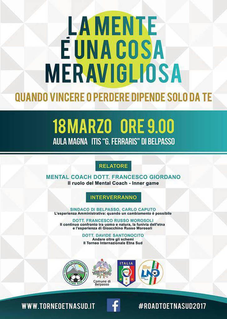 Si è svolta oggi a Belpasso, nell’Aula magna dell’Istituto “Ferraris”, la conferenza dal titolo “La mente è una cosa meravigliosa” promossa da Davide Santonocito, organizzatore del Torneo Internazionale di calcio “Etna Sud-Memorial Gioacchino Russo Morosoli”. Obiettivo dell’incontro l’incentivazione dei ragazzi a non avere paura delle sfide, sia in campo sportivo, sia nella vita.