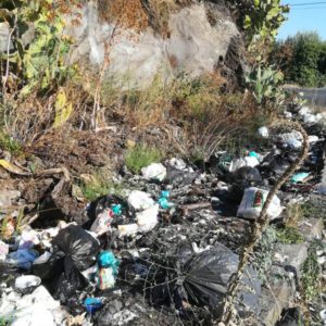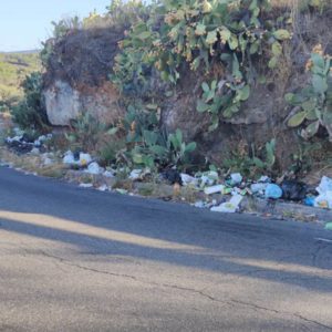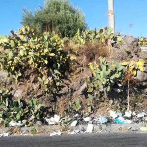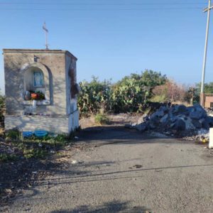 Affrontando la curva, il bordo è una discarica a cielo aperto, mentre nei pressi dell’altarino da due anni e mezzo è presente una vasca di eternit che iniziammo a segnalare nei nostri articoli nell’aprile del 2018, quando sulla poltrona di sindaco sedeva Carlo Caputo (rileggi l’articolo) e che abbiamo continuato a segnalare anche all’attuale primo cittadino Daniele Motta (rileggi l’articolo). La strada è di proprietà della Città Metropoliana di Catania, per cui, come già avvenuto in passato, il sindaco Motta chiamerà in causa l’inefficiente ente che ha rimpiazzato la Provincia Regionale di Catania.