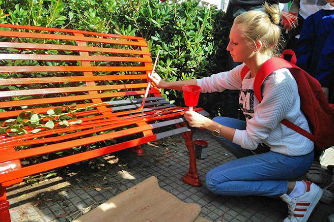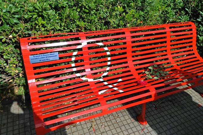 Una delle panchine della villa comunale belpassese colorata di rosso: un posto occupato dalle vittime, ma un posto su cui non siederanno più. Presenti il padre di Veronica Valenti e la mamma di Giordana Di Stefano
