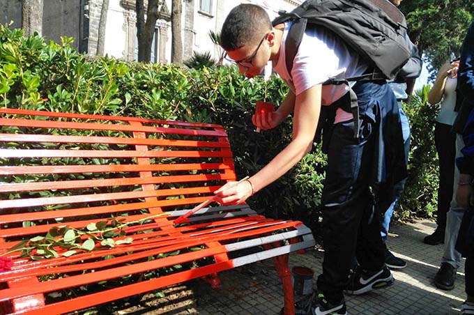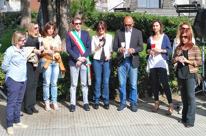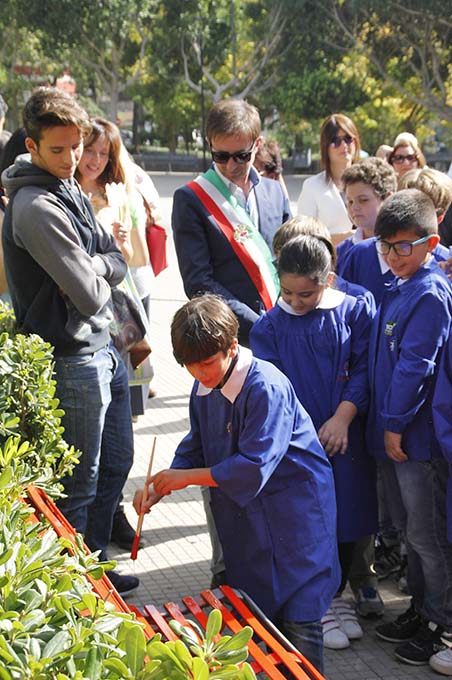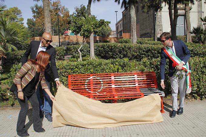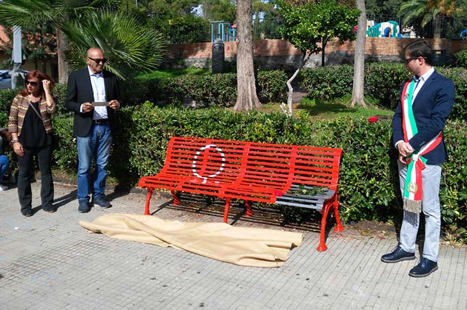 «Sono state coinvolte le scuole superiori ma anche i bambini delle elementari, per educarli alla cultura del rispetto sin da piccoli –, afferma il Sindaco Carlo Caputo –. Oggi non è un giorno gioioso ma un giorno consapevole. Consapevolezza, infatti, è la parola d’ordine che insegnerò ai miei figli, insieme al rispetto. Mi sono spesso chiesto se i simboli siano veramente importanti, ma in fondo l’uomo ha sempre avuto bisogno di simboli a cui fare riferimento, quindi credo che questa panchina rossa sia davvero un riferimento, perché riguarda tutti noi. Quando avviene un femminicidio, non è solo un problema di pena e di giustizia, ma è un problema che diventa sociale, è nostro».