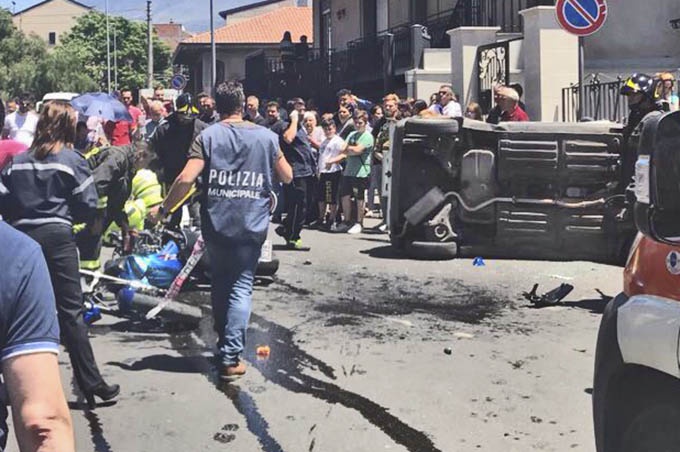 Impatto violentissimo: la moto si spezza in due, l’auto si ribalta