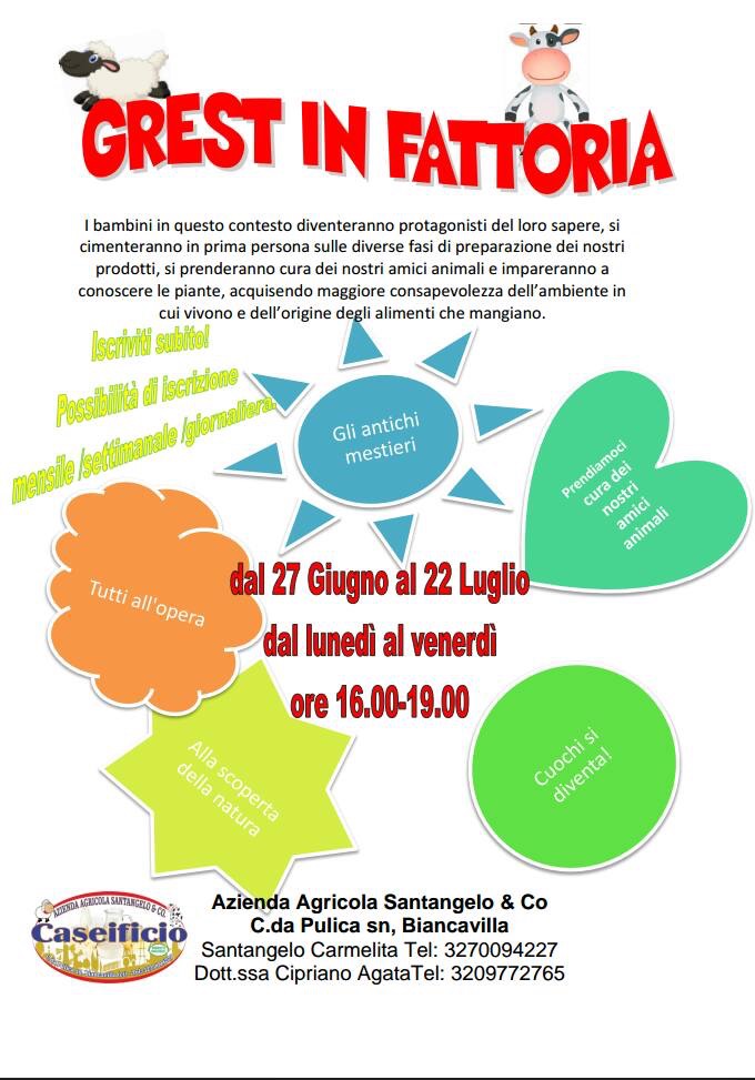 Prenderà il via lunedi 27 Giugno, la III edizione del “Grest in Fattoria”, che si svolgerà presso l’Azienda Agricola Santangelo &CO in contrada Pulica a Biancavilla. Le attivitá ludico ricreative, che si svolgeranno tutti i giorni da lunedi a venerdi dalle ore 16 alle ore 19, saranno rivolte a tutti i bambini dell’ hinterland di età compresa tra i 4 e i 12 anni.