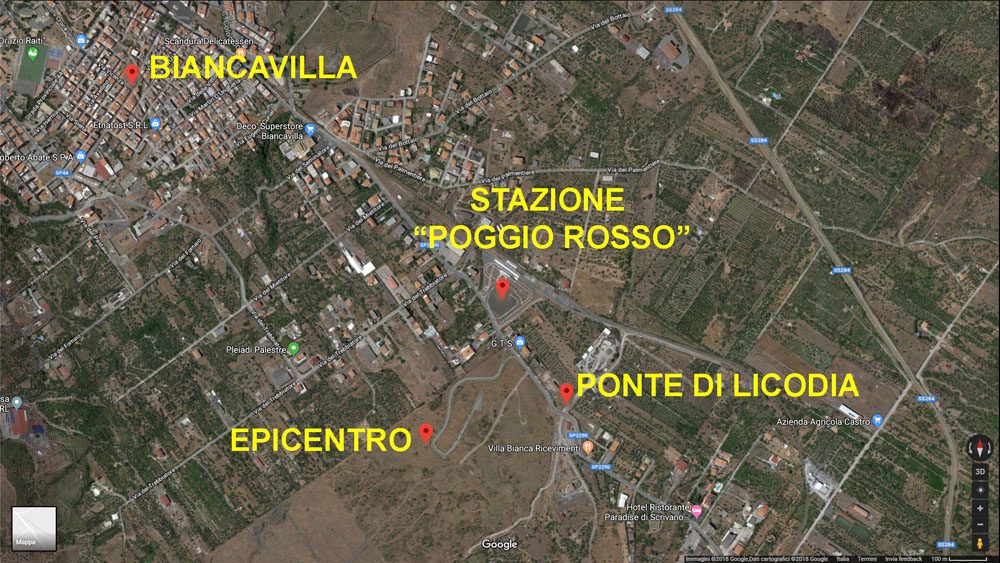 La prima notizia diramata parla di magnitudo 5.0 ed epicentro a Santa Maria di Licodia. Il dato verrà poi via via affinato: prima 4.8 sino al definitivo 4.6 (dato attualmente preferito) con epicentro individuato a Biancavilla circa 300 metri a sud della Stazione “Poggio Rosso” della Ferrovia Circumetnea (esattamente nel centro della costruenda Zona artigianale), al confine con Santa Maria di Licodia, ad una profondità di 6 chilometri: Terremoto di magnitudo Mw 4.6 del 06-10-2018 ore 02:34:20 (Italia) in zona: 1 km S Biancavilla (CT), profondità km. 6.