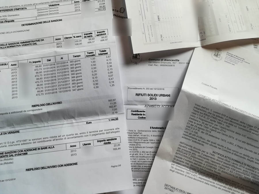 Non basta un territorio costellato da discariche e microdiscariche abusive – la provinciale 156 (la strada della vergogna) e la strada delle Vigne, solo per qualche evidente esempio –, adesso per il cittadino di Biancavilla sono pure arrivate le carissime bollette TARES-TARI, udite udite del 2013. La data che reca l’imposizione di pagamento dell’imposta è dicembre 2018, a pochi giorni dalla prescrizione. Ma la vera e propria beffa sono i pagamenti richiesti: carissimi, per immobili non dovuti (o almeno non dovuti per quelle cifre) e addirittura bollette duplicate per lo stesso anno d’imposizione.