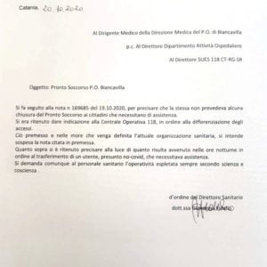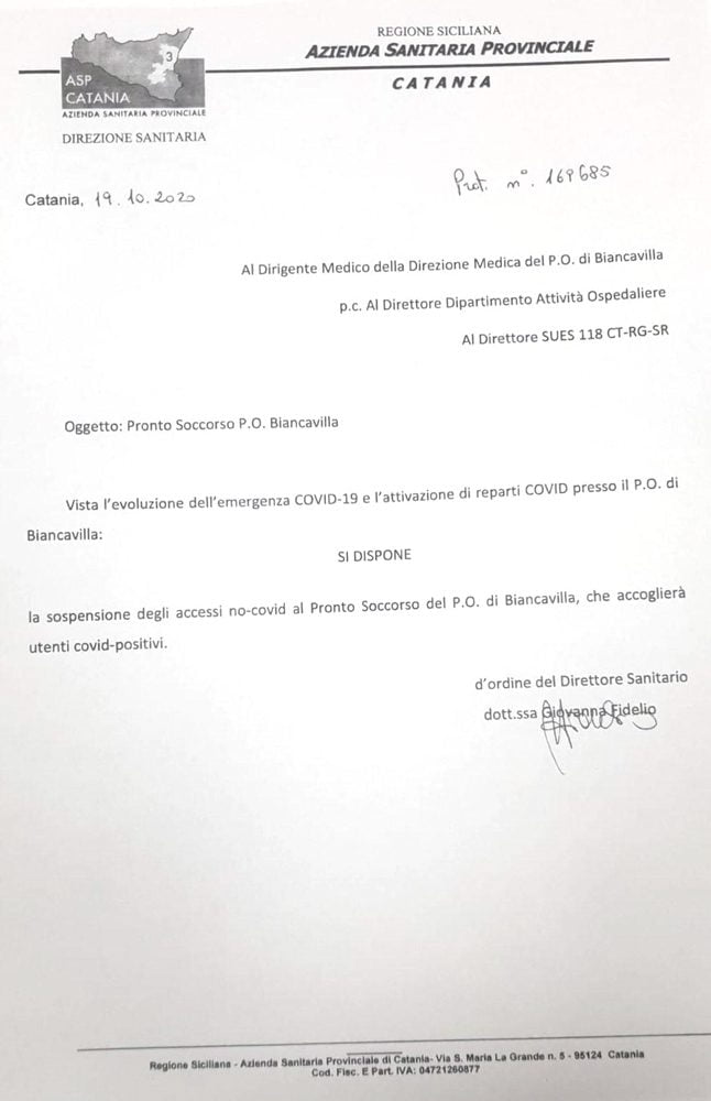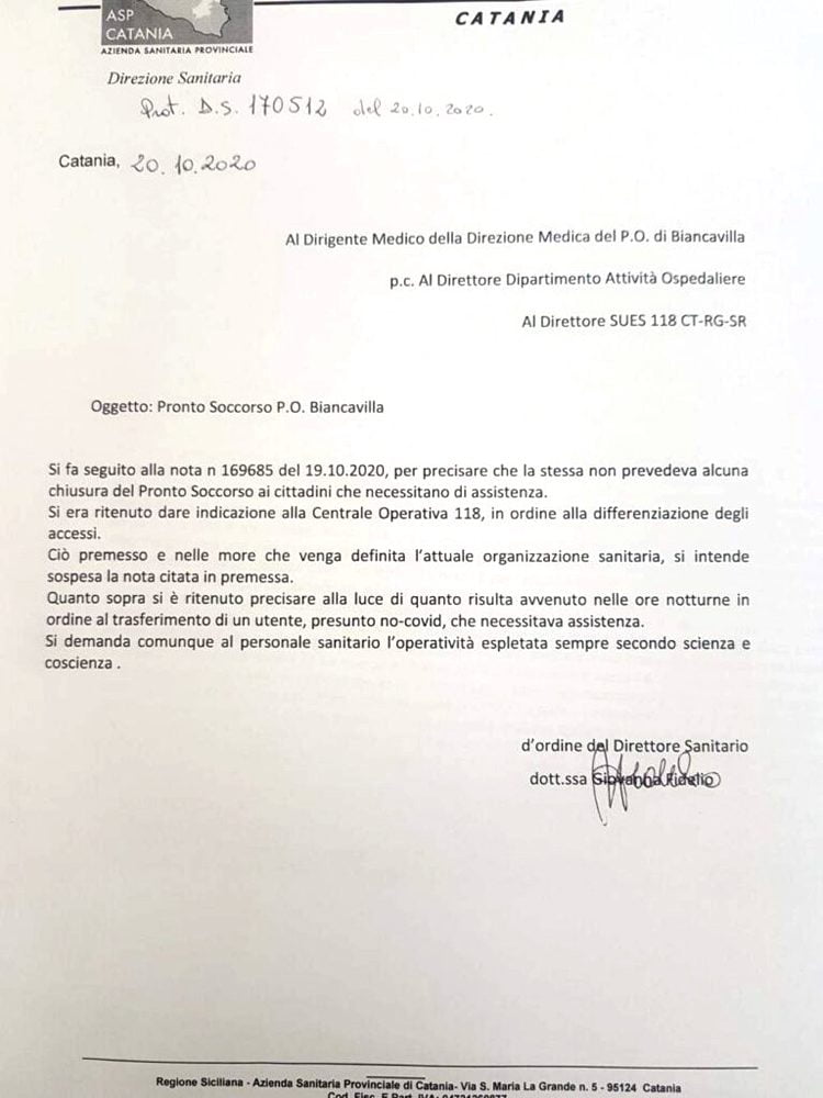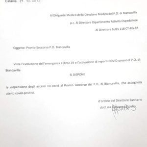 1) In relazione alla nota del 19/10/2020 con cui l’Asp dispone la sospensione degli accessi no-covid al Pronto Soccorso del P.O. di Biancavilla, si chiede un chiarimento in merito alla nota stessa e, in particolare, se fosse rivolta – o meno – solo alle ambulanze del SUES 118 CT-SR-RG e se, dunque, il Pronto Soccorso sia rimasto regolarmente aperto ad accessi no-covid che vi si fossero recati autonomamente.