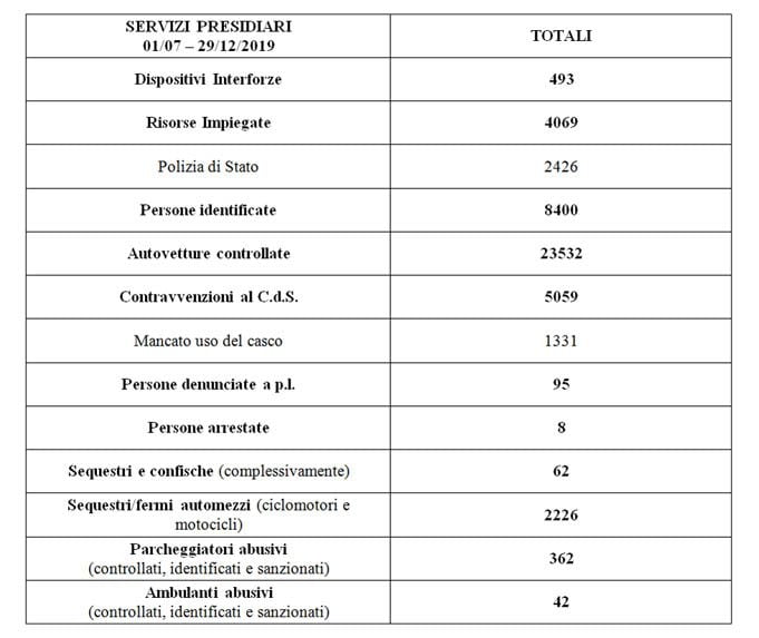 In particolare, dal 1 luglio 2019 al 31 dicembre 2019, dopo le determinazioni assunte in sede di Comitato di Ordine e Sicurezza Pubblica presso la Prefettura, la Questura ha tecnicamente coordinato i seguenti Servizi, tutti da considerare straordinari, quindi oltre le attività ordinarie dispiegate autonomamente da ogni singola Forza di Polizia. Giova precisare che tali dispositivi presidiari sono stati introdotti per la prima volta e, quindi, da considerare innovativi in tal senso :