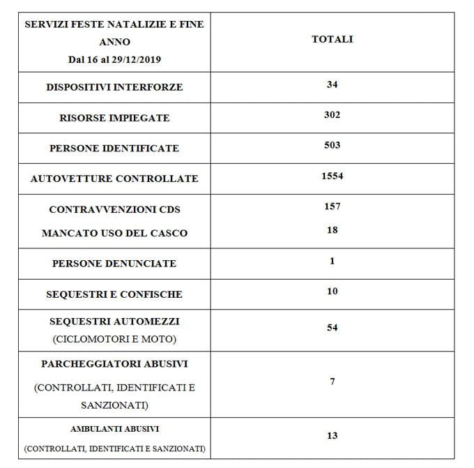Dati inerenti i risultati delle sole specifiche attività interforze con Ordinanza del questore relative ai Dispositivi Presidiari per il solo periodo festivo natalizio.