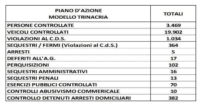 Dati inerenti i risultati delle attività interforze con Ordinanza del questore ed analisi in Prefettura inerenti il cd. Piano Trinacria, relative ad attività straordinarie su tutta la provincia;