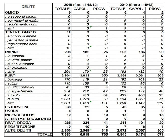 Dati statistici della delittuosita anno 2019 nella provincia di Catania, in comparazione con l’anno 2018;