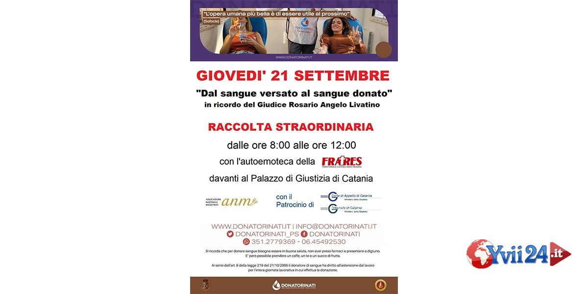 La Giunta Esecutiva Sezionale del Distretto della Corte di Appello di Catania comunica che in data 21 settembre p.v., dalle ore 8:00 alle ore 12:00 si terrà nel piazzale antistante il Palazzo di Giustizia di Catania una raccolta/donazione straordinaria di sangue in collaborazione con Donatorinati – Associazione donatori volontari Polizia di Stato e con Fratres Territoriale Catania – Enna – Messina. L’iniziativa, patrocinata dall’Associazione Nazionale Magistrati, dal Tribunale di Catania e dalla Corte di Appello di Catania, è volta a commemorare il Giudice Rosario Angelo Livatino*, nell’anniversario della sua tragica scomparsa.