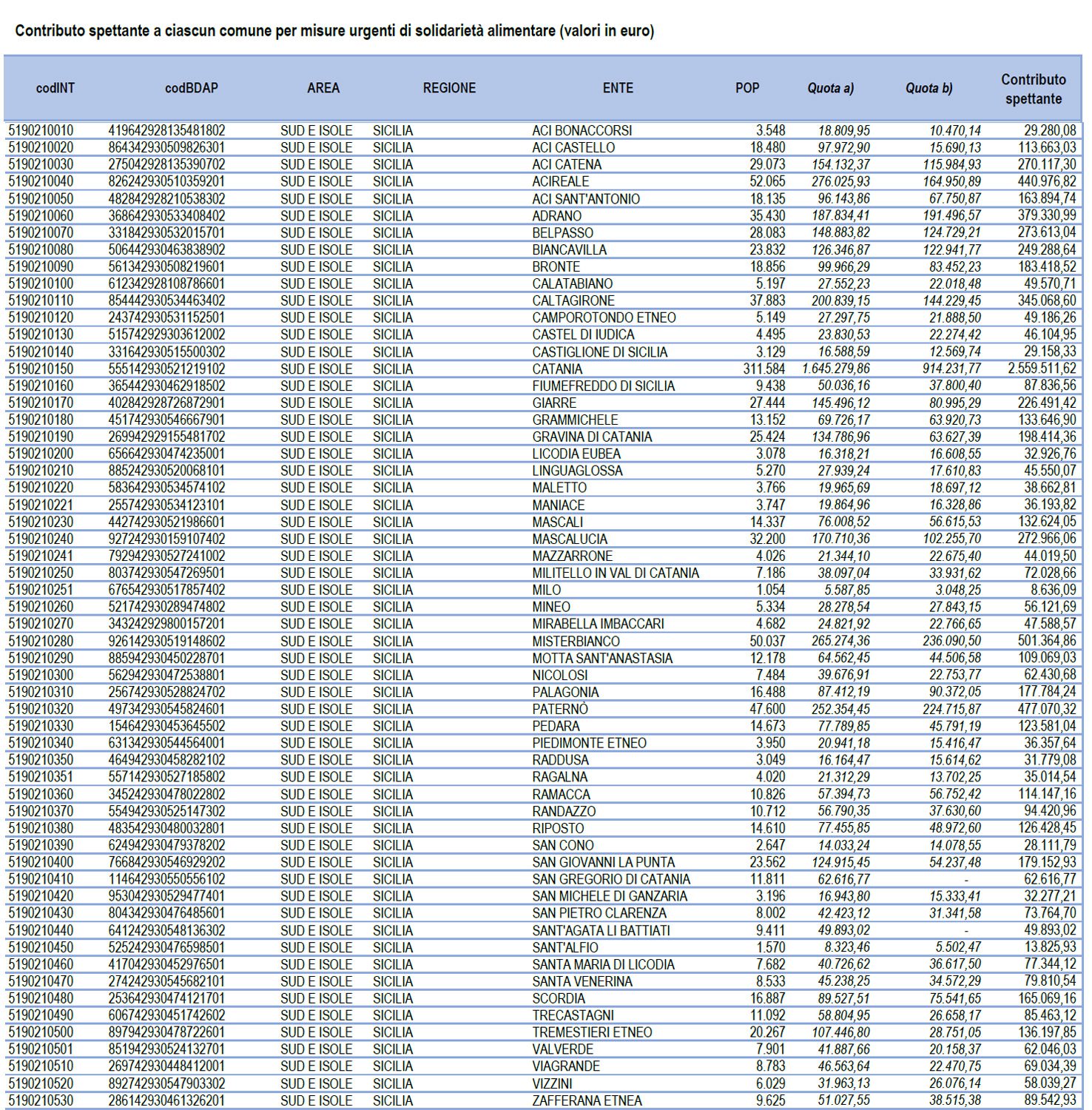 Dopo l’annuncio del Presidente del Consiglio dei ministri, Giuseppe Conte, nel corso della diretta di sabato sera, sono state ripartite le somme ai comuni per l’emergenza Coronavirus (la tabella per i comuni del catanese è consultabile a fianco). I fondi potranno essere utilizzati dalle amministrazioni comunali per sostenere le proprie comunità.