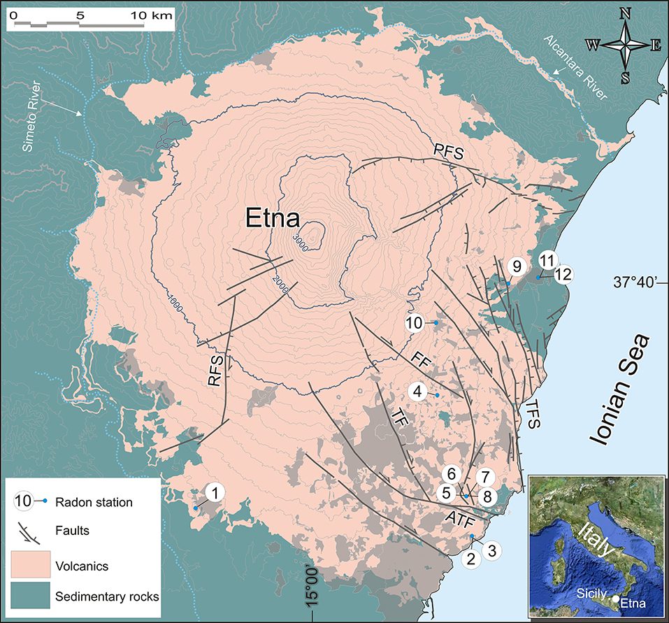 tre studiosi dell’Istituto Nazionale di Geofisica e Vulcanologia di Catania incentrata sull’emissione dalle faglie dell’Etna di gas radon, definito altamente cancerogeno dall’Organizzazione Mondiale della Sanità. Lo studio è stato effettuato all’interno di 7 abitazioni che sorgono a diversa distanza da alcune faglie presenti sul territorio del vulcano per un periodo di circa 3 anni. Questi sensori hanno rivelato delle concentrazioni medie annue spesso superiori a 100 Bq/m3 (Bequerel per metro cubo) – valore di primo livello di attenzione – e in alcuni casi un valore medio di 300 Bq/m3, con punte superiori a 1.000 Bq/m3. A portare avanti lo studio Marco Neri, Salvatore Giammanco e Anna Leonardi.
