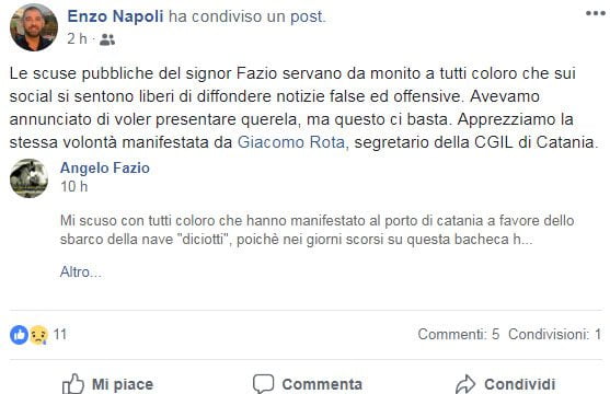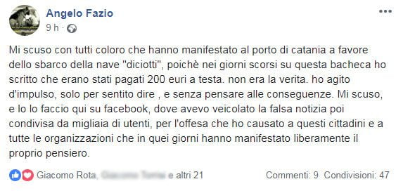 “Mi scuso con tutti coloro che hanno manifestato al porto di catania a favore dello sbarco della nave “diciotti”, poichè nei giorni scorsi su questa bacheca ho scritto che erano stati pagati 200 euri a testa. non era la verita. ho agito d’impulso, solo per sentito dire , e senza pensare alle conseguenze. Mi scuso, e lo lo faccio qui su facebook, dove avevo veicolato la falsa notizia poi condivisa da migliaia di utenti, per l’offesa che ho causato a questi cittadini e a tutte le organizzazioni che in quei giorni hanno manifestato liberamente il proprio pensiero”.