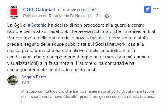 “La Cgil di #Catania ha deciso di non procedere alla querela contro l’autore del post su Facebook che aveva dichiarato che i manifestanti al Porto a favore dello sbarco della nave #Diciotti. Le decisione è stata presa a seguito delle scuse pubblicate sul Social network, ossia la stessa piattaforma che ha dato rilievo amplissimo (oltre 8 mila condivisioni, che presuppongono dunque un numero ben più ampio di visualizzazioni) alla falsa notizia. L’autore ci ha contattati e ha conseguentemente pubblicato questo post”.