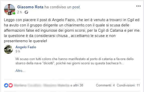 “Leggo con piacere il post di Angelo Fazio, che ieri è venuto a trovarci in Cgil ed ha avuto con il gruppo dirigente un chiarimento, con il quale si scusa delle affermazioni false ed ingiuriose dei giorni scorsi, per la Cgil di Catania e per me la questione è da considerarsi chiusa, accettiamo le scuse e non presenteremo le querele!”