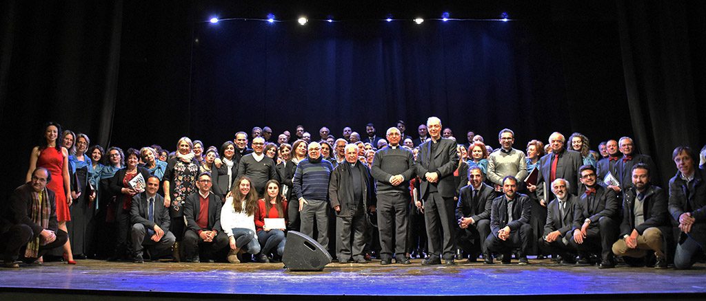 Ad avvicendarsi sul palcoscenico, dietro la conduzione della presentatrice Gabriella Arena, le corali: “Corpus Domini” (diretta dal maestro Pierpaolo Cuffari), “Canticum Vitae” (diretta dal maestro Salvatore Signorello), la Schola Cantorum “Maria Ss. Immacolata” (diretta dal maestro Pietro Leotta), “Cristo Re” (diretta dal maestro Emanuele Puleo), “Maria Ss. della Guardia” (diretta dal maestro Alessandro Corallo), che hanno eseguito una serie di brani tutti composti dal maestro Frisina. Gli ultimi due brani sono stati eseguiti da tutte le corali riunite e dirette proprio dal celebre compositore di musiche sacre.
