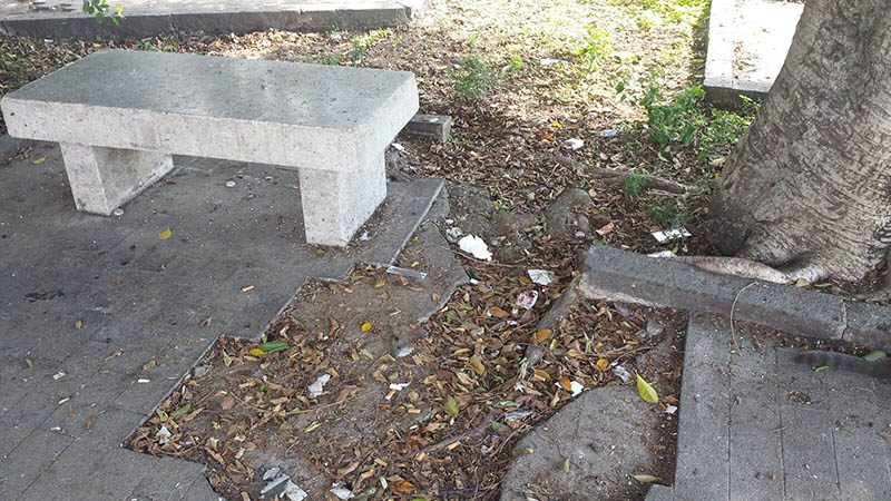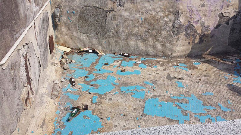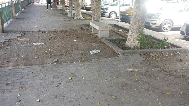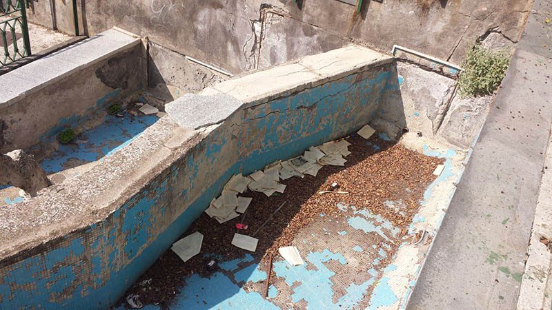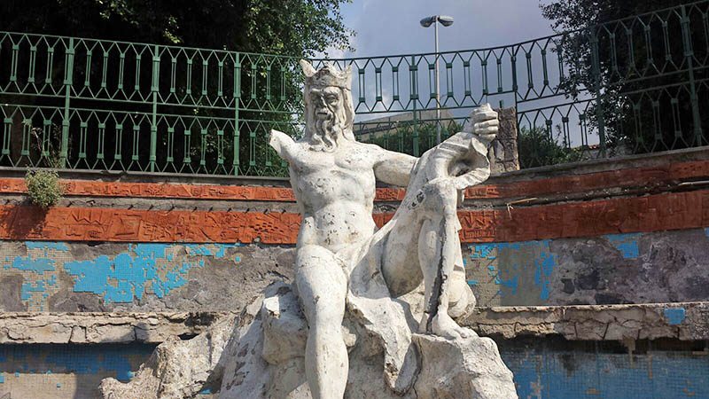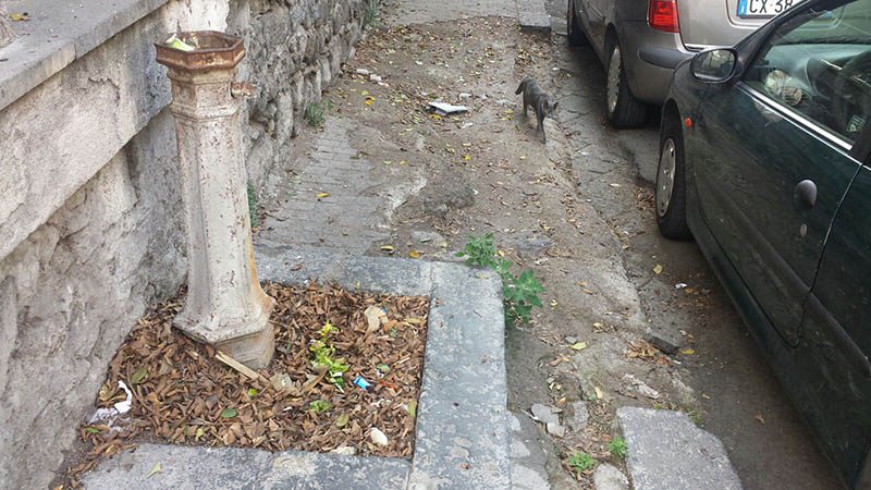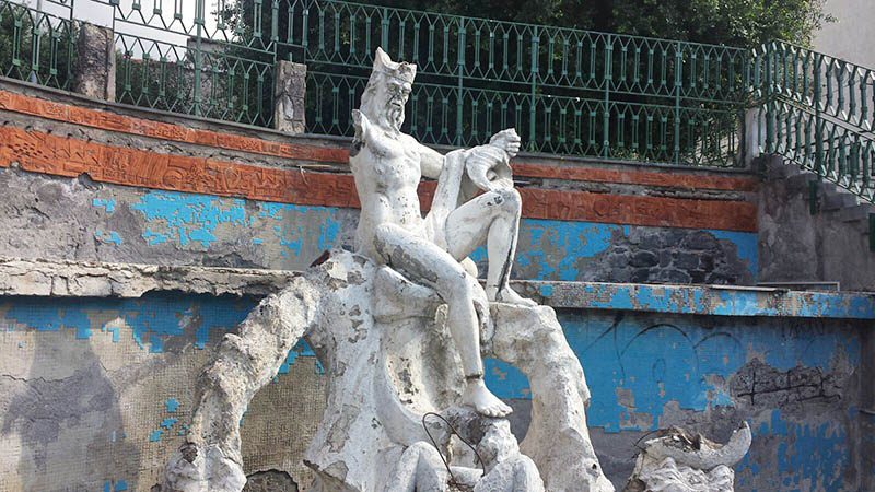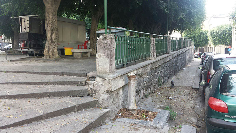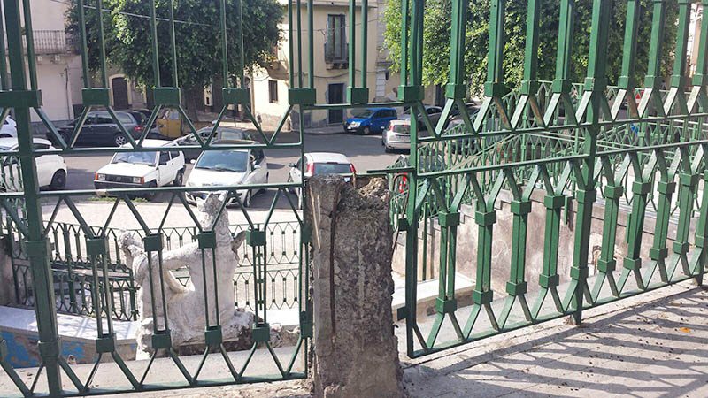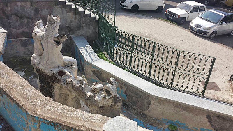 Tutto attorno la piazza è rovinato: incuria e sporcizia sulle scale, nella strada che costeggia la discesa verso la fontana. Lastre di pavimentazione saltate, pilastri sgretolati e ringhiere spezzate. Sorvolando sul fatto che si tratta, ormai, di sospirare su ciò che rimane di un’opera scultorea e non più idraulica, perché acqua, da quella che era stata concepita come una fontana, non ne sgorga da tempo immemore.
