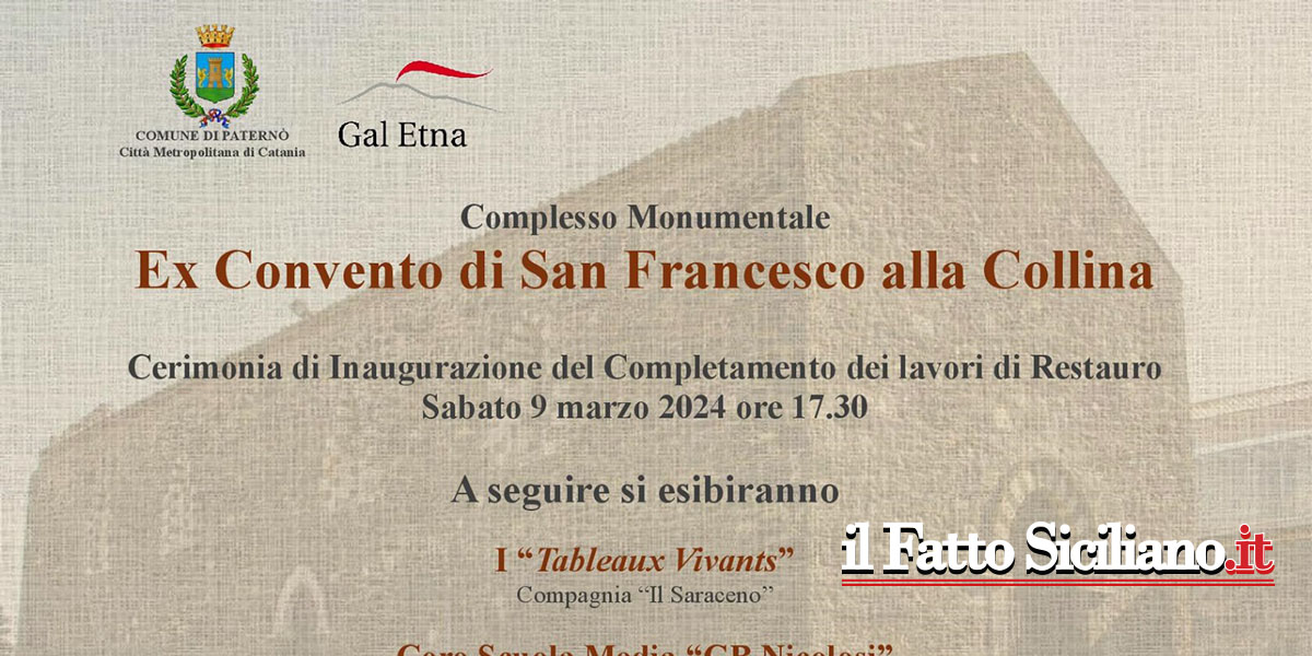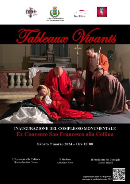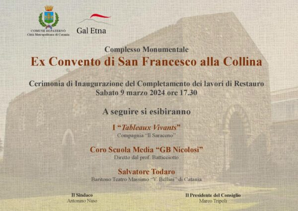 Il Gal Etna e il comune di Paternò sono lieti di cerimoniare l’inaugurazione del completamento dei lavori di restauro dell’ex Convento di San Francesco alla Collina storica, in occasione di questo evento si esibiranno i “Tableaux Vivants – Compagnia “Il Saraceno”.