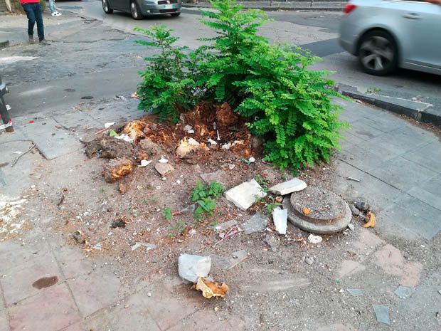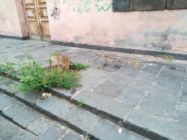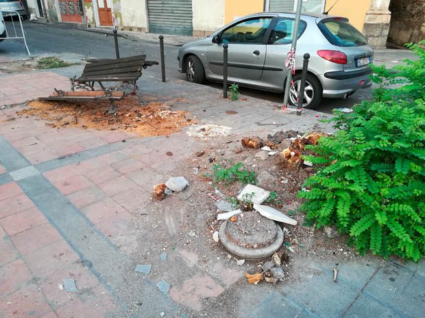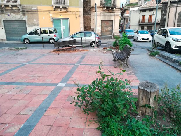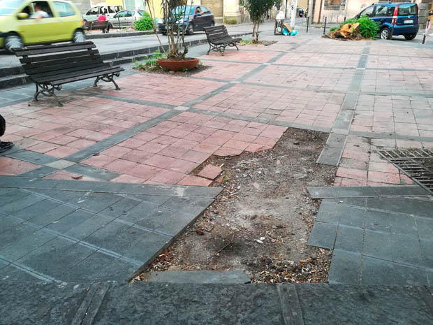 Non è solo il danno della mancanza degli alberi, adesso, a determinare quell’aspetto negletto della piazza Martiri d’Ungheria, sono anche le mattonelle della piazza scollate, che potrebbero essere saltate, alcune, dopo lo schianto dell’albero, ma non tutte, anche perché ci sono molte altre piazze e molti marciapiedi, compresi quelli delle via principali, come via Emanuele Bellia, dove non sono caduti alberi né pali, o via Vittorio Emanuele, dove la mancanza di mattonelle, in alcuni casi, è tale da poter rappresentare persino un pericolo per i pedoni.