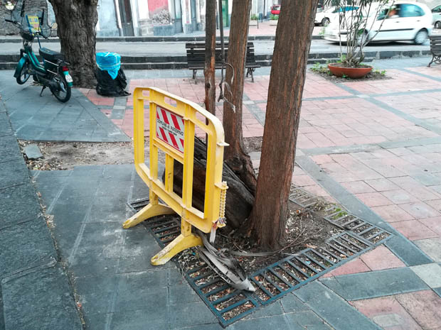 Quell’esiguo verde che la città possiede è dovuto a degli imprenditori che attraverso uno spartitraffico, una rotonda, pubblicizzano le proprie attività e, al contempo, donano ossigeno a quell’area, ma il resto quello dei parchi, della villa e delle piazze è comunale e, la gestione compete all’amministrazione, con operai che sono incaricati a svolgere questo ruolo. L’albero venuto giù, e che ha schiantato una panchina (non osiamo immaginare cosa sarebbe accaduto se vi fossero state persone sedute in quel momento) è stato rimosso dai Vigili del fuoco del locale distaccamento; un altro che presentava un avanzato degrado sulle radici attaccate da funghi (insomma la causa del collasso dell’altro albero), è stato spostato, e un altro ancora sfoltito per alleggerirlo e prevenirne la caduta, mentre le transenne che si trovano nella piazza sembrano più voler rispondere all’esigenza di affermare la presenza dell’autorità cittadina, che a proteggere da imminenti pericoli. La panchina distrutta resta invece al suo posto, quasi un ready-made di duchampiana memoria.