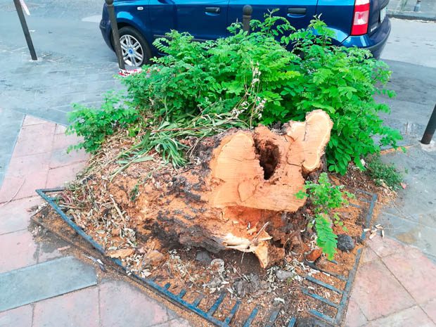Ma ad un’amministrazione che ha fatto dello scerbamento la sua bandiera (come testimoniato da numerose foto sui social all’indomani dell’insediamento), come è potuto sfuggire lo stato di malessere di un esemplare così caratteristico per la piazza, e di altri che sembra per poco non, hanno avuto la medesima sorte? Eppure è successo!