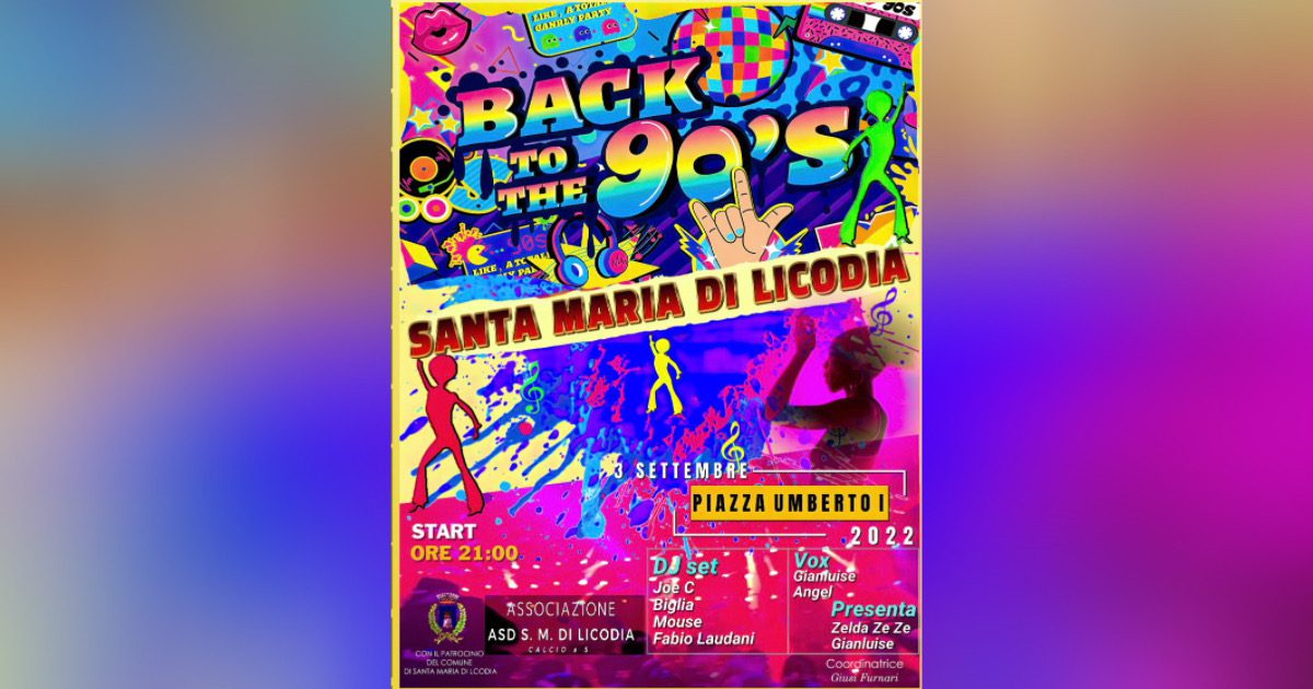 Ormai è tutto pronto ed in tanti non vedono l’ora di fare un salto nel passato ritornando a rivivere, almeno per una serata, i mitici ed indimenticabili anni della music ’90. Non servirà una DeLorean per viaggiare nel tempo ma, tutto questo, sarà possibile grazie alla proposta lanciata sui social da Giusy Furnari, che giorno dopo giorno è stata sposata e sostenuta da tanti altri licodiesi. L’appuntamento, dunque, è per sabato 3 settembre a partire dalle ore 21:00 in piazza Umberto con la serata “Back to the 90’s”. “L’idea è nata come una provocazione” ci spiega Giusy Furnari “per spronare il paese a fare qualcosa per un rilancio dell’aggregazione e della socialità tra noi cittadini. Ho visto che la proposta è piaciuta ed altre persone si sono aggregate per la realizzazione di questa iniziativa. Ringrazio fortemente tutti gli sponsor che inaspettatamente hanno voluto donare anche piccole somme per la copertura delle spese dell’evento”.