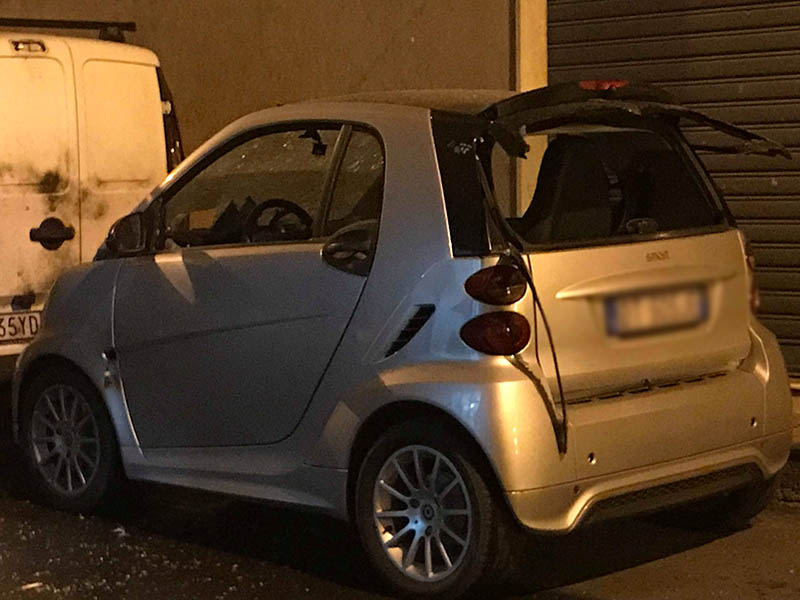 Potrebbero esserci motivi personali dietro la bomba carta che ha danneggiato una Smart, provocando un’esplosione udita in tutto il paese, posteggiata fra via Cairoli e via Vittorio Emanuele a Santa Maria di Licodia nella serata di martedì 6 febbraio. Ad alterare la normalità di una tranquilla serata “sanremese” davanti alla tv, il boato che ha scosso la cittadina intorno alle 23. Sul posto, oltre ai curiosi, sono giunti i Carabinieri della locale stazione e del Nucleo radiomobile della Compagnia di Paternò che, nel giro di qualche ora, dopo l’attento esame di diverse telecamere di videosorveglianza della zona, hanno denunciato a piede libero per danneggiamento un uomo, immortalato dalle immagini.