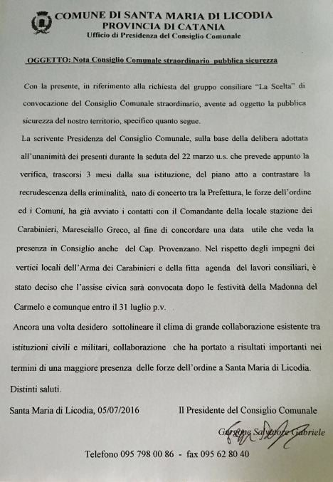 Gabriele Gurgone, attraverso la quale ha voluto dare risposta alla richiesta del gruppo d’opposizione “La Scelta” protocollata lo scorso 25 giugno, avente per oggetto la convocazione del civico consesso “straordinario ed urgente” per affrontare le tematiche sulla sicurezza del territorio.