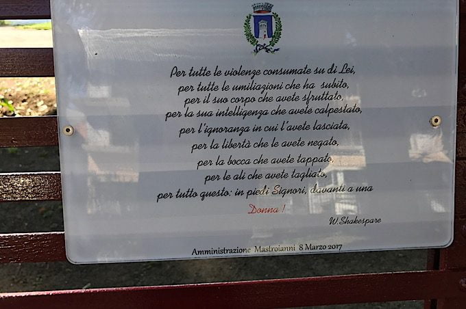 Sulla panchina rossa che è stata posta nei pressi del parco giochi della villa comunale, è stata applicata una targa con su riportati dei versi di William Shakespeare con su scritto: