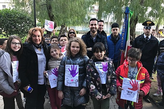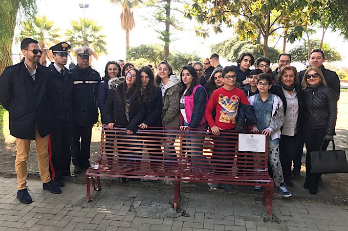 Altro momento importante – che come vi dicevamo è stato rinviato a questa mattina a causa del cattivo tempo – è stata l’inaugurazione della panchina rossa all’interno della villa comunale Belvedere, alla presenza delle autorità civili e militari locali e a tutti gli studenti della scuola secondaria di primo grado della “Don Bosco”.