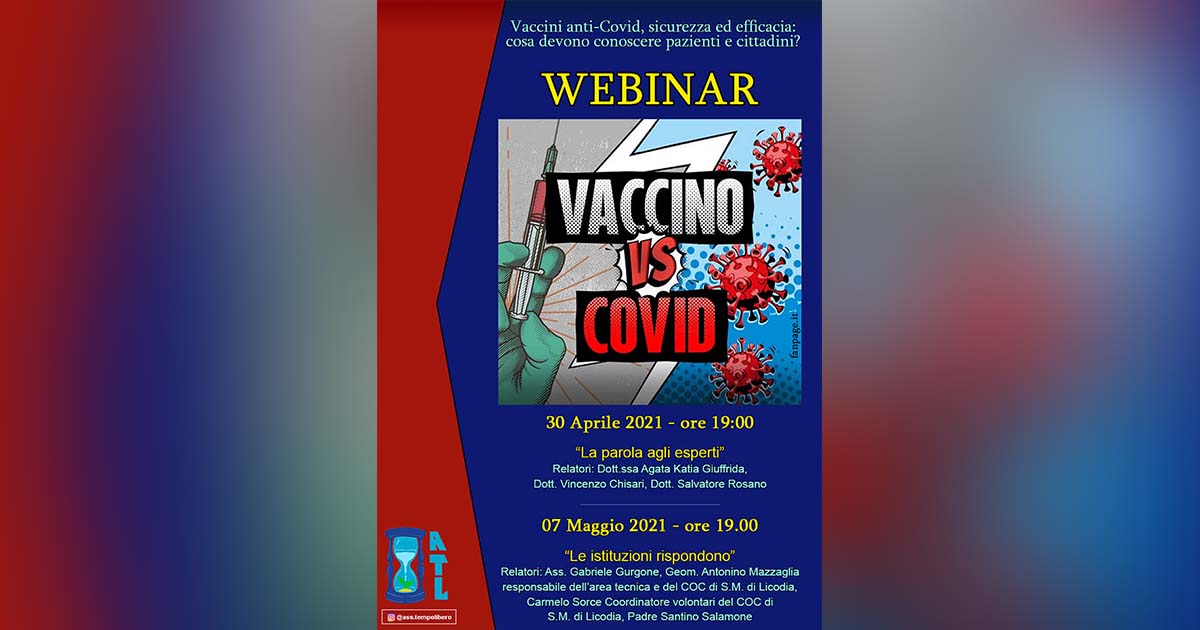 La neo costituita associazione culturale di Santa Maria di Licodia “Tempo Libero” ha organizzato per le giornate di venerdì 30 aprile e per venerdì 7 maggio un webinar dal titolo “Vaccino vs Covid”. L’evento, che sarà trasmesso a partire dalle 19:00 sulla pagina Facebook dell’associazione, tratterà la tematica del covid e delle vaccinazioni, attraverso esperti del settore.