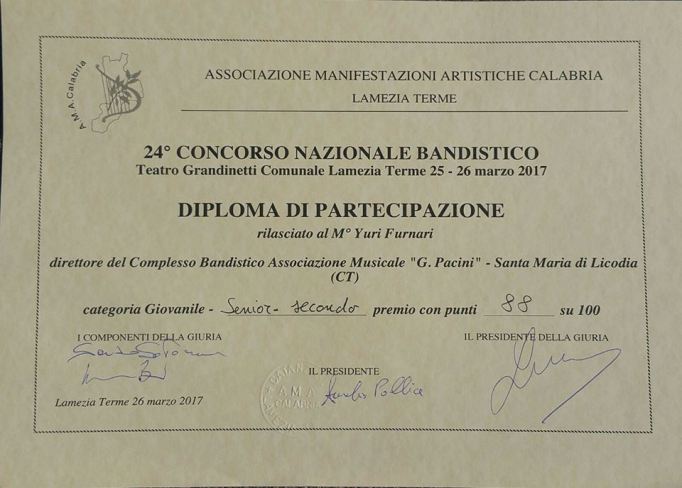 Nuovo successo per i giovani musicisti della Junior Band “Pacini” di Santa Maria di Licodia che anche per l’edizione 2017, la ventiquattresima, del “Concorso Nazionale Bandistico A.M.A Calabria” hanno riconfermano il secondo posto nella categoria “giovanile-junior” già ottenuto lo scorso anno, con un punteggio di 88 centesimi. Il concorso, che si è tenuto all’interno del Teatro comunale “Grandinetti” di Lamezia Terme lo scorso 26 marzo, rappresenta ormai da qualche anno una delle più importanti kermesse bandistiche dello scenario musicale italiana. La giuria era composta da: Antoine Langagne, Lieutenant-Colonel Directeur de la Musique de la Garde Républicaine, Giovanni Bruni, Sandro Satanassi e Francescantonio Pollice.