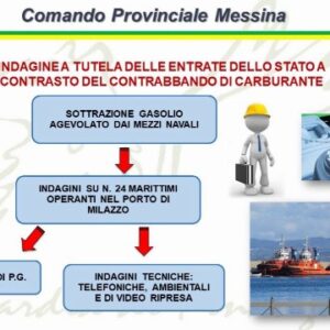 Nell’ambito di articolate attività di indagine di polizia giudiziaria, coordinate dalla Procura della Repubblica di Barcellona Pozzo di Gotto, i Finanzieri del Comando Provinciale di Messina hanno dato esecuzione ad un’ordinanza cautelare reale, emessa dal Giudice per le indagini preliminari presso il Tribunale di Barcellona Pozzo di Gotto, relativamente a ventisette autoveicoli utilizzati da ventiquattro portuali operanti nel porto di Milazzo (ME), per l’illecito trasporto, in contrabbando, di numerosi litri di carburante illecitamente sottratto dai rimorchiatori operanti nel locale porto.