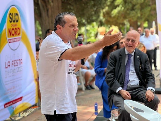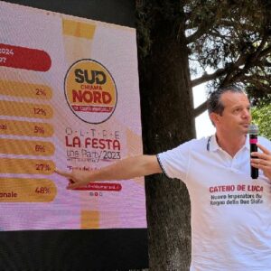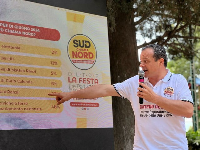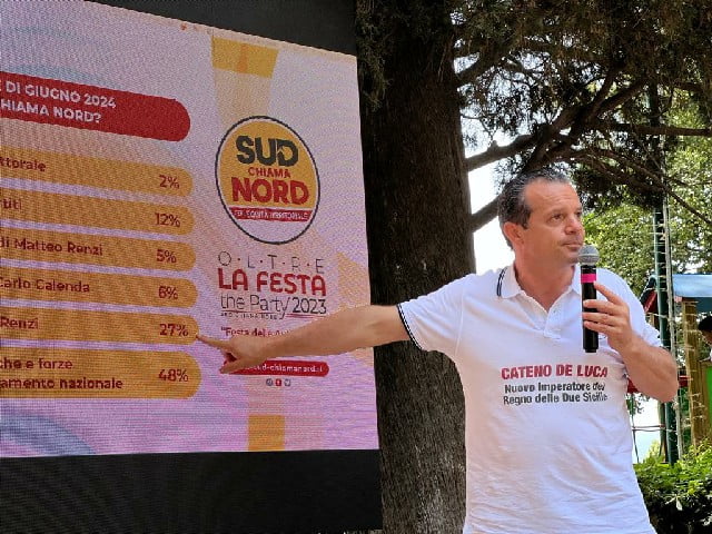 Il leader di Sud chiama Nord e sindaco di Taormina, Cateno De Luca, alla festa dell’Autonomie e dell’Equità territoriali organizzata a Taormina a Fiumedenisi (comune collinare della Riviera jonica messinese ove Cateno è nato e dove ha iniziato 18enne il suo percorso politico divenendo un giovanissimo consigliere comunale e poi nel 2003 anche primo cittadino) ha annunciato che si candiderà elezioni Europee 2024 “Se la potenzialità di voto degli italiani per Sud chiama Nord è tra il 5 e il 7 per cento, non posso che confermare la mia candidatura alle Europee 2024”.