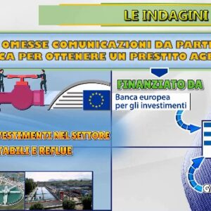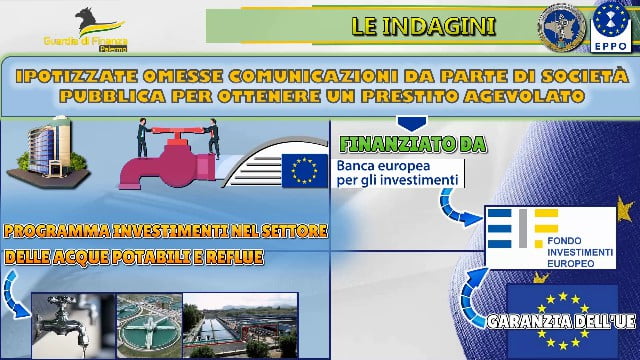 Le indagini – nascenti dalla denuncia sporta dalla Banca Europea degli Investimenti (BEI) direttamente presso la sede EPPO di Lussemburgo – condotte dagli specialisti del Nucleo di polizia economico finanziaria di Palermo – Gruppo Tutela Spesa Pubblica sotto il coordinamento della Procura Europea, hanno riguardato un prestito agevolato di circa 20 milioni di euro che la società pubblica aveva ottenuto dalla Banca Europea per gli Investimenti (BEI) a valere sul Fondo Europeo per gli Investimenti Strategici (“EFSI”) con garanzia concessa dall’Unione Europea, per la realizzazione di un programma di investimento nel settore della produzione di acqua potabile e trattamento delle acque reflue.