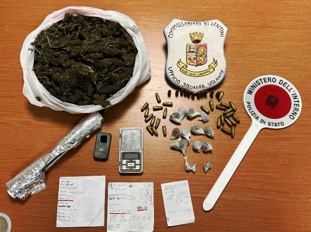 Inoltre, nel corso della nottata, agenti del Commissariato di Lentini hanno arrestato un altro uomo di 59 anni, trovato in possesso di droga e lo hanno denunciato per possesso di munizioni illegalmente detenute. In specie, gli investigatori lentinesi hanno effettuato a casa dell’arrestato una perquisizione domiciliare che consentiva di rinvenire 500 grammi di marijuana, suddivisa in dosi pronte per la vendita, 1,60 grammi di cocaina, 39 proiettili cal. 7.65 e vario materiale utilizzato per il confezionamento della droga. Il cinquantanovenne, dopo le incombenze di legge e su disposizione dell’Autorità Giudiziaria competente, è stato posto ai domiciliari.