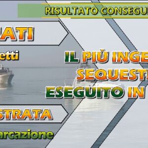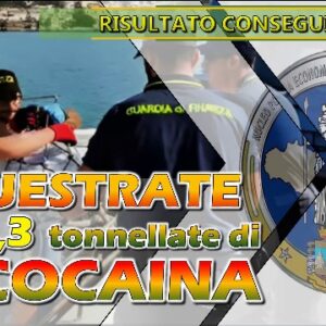 I Finanzieri del Comando Provinciale di Palermo e della componente aeronavale del Corpo, nell’ambito di un articolato dispositivo di contrasto ai traffici illeciti via mare, hanno eseguito un’eccezionale operazione di servizio che ha portato, al momento, al fermo, disposto dalla Procura della Repubblica – Direzione Distrettuale Antimafia di Palermo, di 5 soggetti – un italiano, 2 tunisini, un francese ed un albanese – e il sequestro di 1 imbarcazione e di oltre 5,3 tonnellate di sostanza stupefacente del tipo cocaina. Si tratta del più importante sequestro di cocaina mai eseguito sull’intero territorio nazionale e uno dei più rilevanti a livello mondiale.