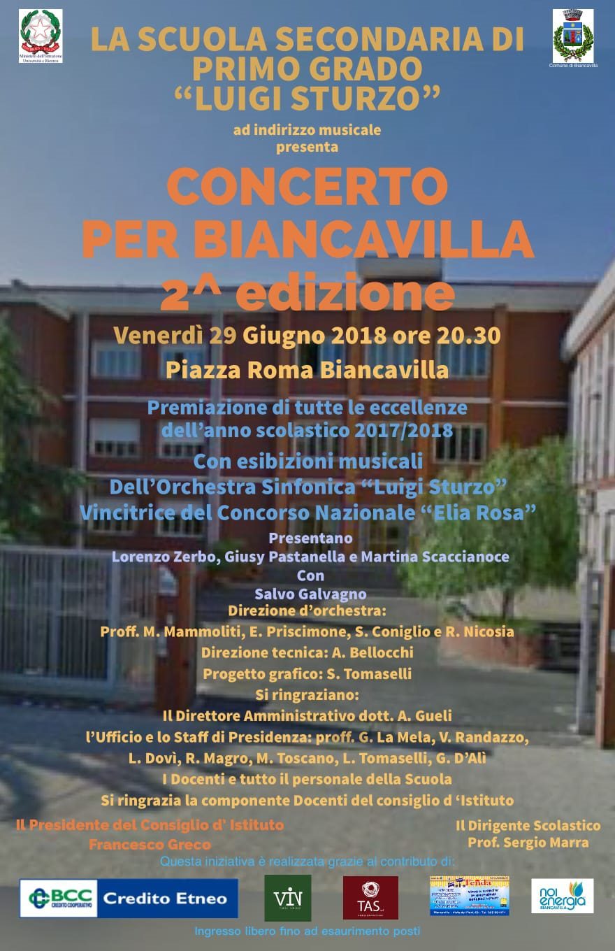 Si terrà venerdì 29 giugno alle 20:30 in piazza Roma a Biancavilla, la seconda edizione del “Concerto per Biancavilla” allestito dalla Scuola secondaria di primo grado “Luigi Sturzo”. Nel corso della serata verranno premiate le eccellenze dell’anno scolastico 2017/2018, alle quali verranno conferite targhe ricordo.